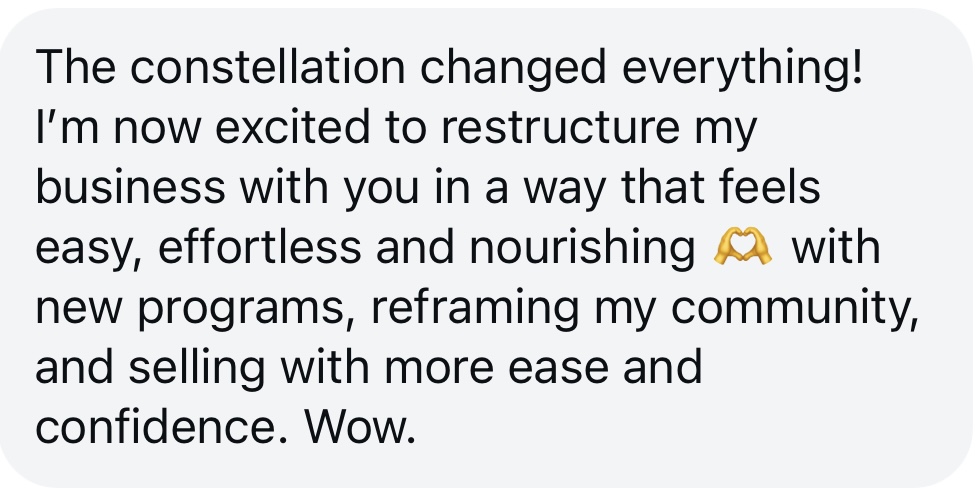 Where my work is rooted in directly perceiving businesses as beings — as spirits with intelligence, needs, and structure — I help women learn how to see, listen to, and relate to their businesses in the same way. Through business constellation work, I work with the unseen architecture a business reveals, and translate what is shown into language, positioning, strategy, and systems that a woman on a mission can actually live and lead from.